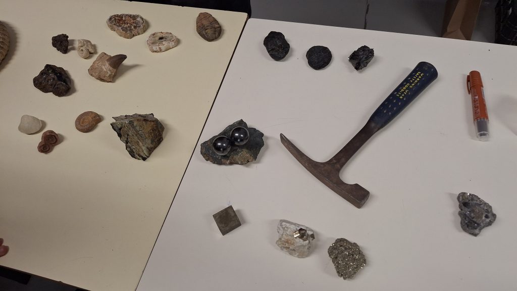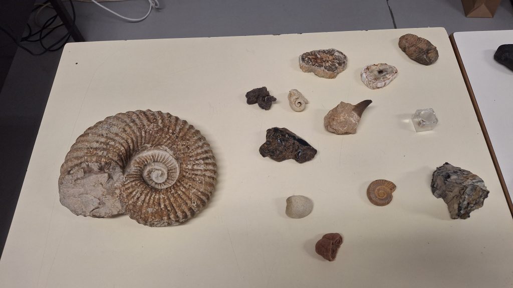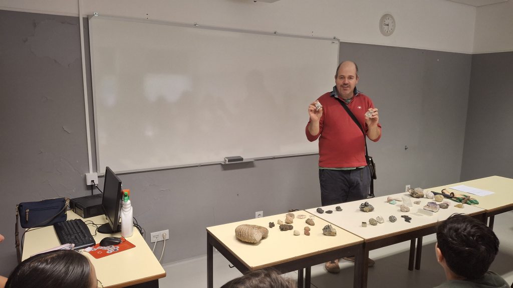 Quanto aos fósseis, o geólogo apresentou dentes de várias espécies de tubarões, trilobites, amonites e outros restos e vestígios de seres extintos há Ma. Mostrou também diversos tipos de carvões e explicou o processo que leva à sua formação. Os fósseis que arrancaram mais gargalhadas foram os coprólitos (fezes fossilizadas). Apesar de saberem que estão petrificadas há Ma., a maioria dos alunos acabou por cheirá-los com ar enjoado! Sempre acompanhados de explicações, observaram âmbar com insetos, troncos fossilizados, plantas impressas, moldes externos e internos de seres marinhos como o da Turritela que associaram a um unicórnio.