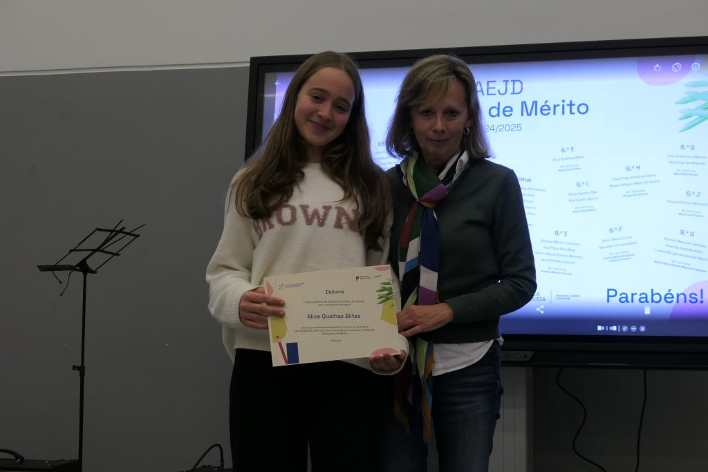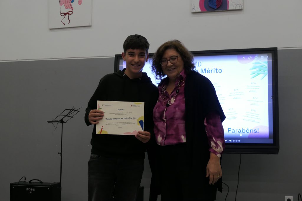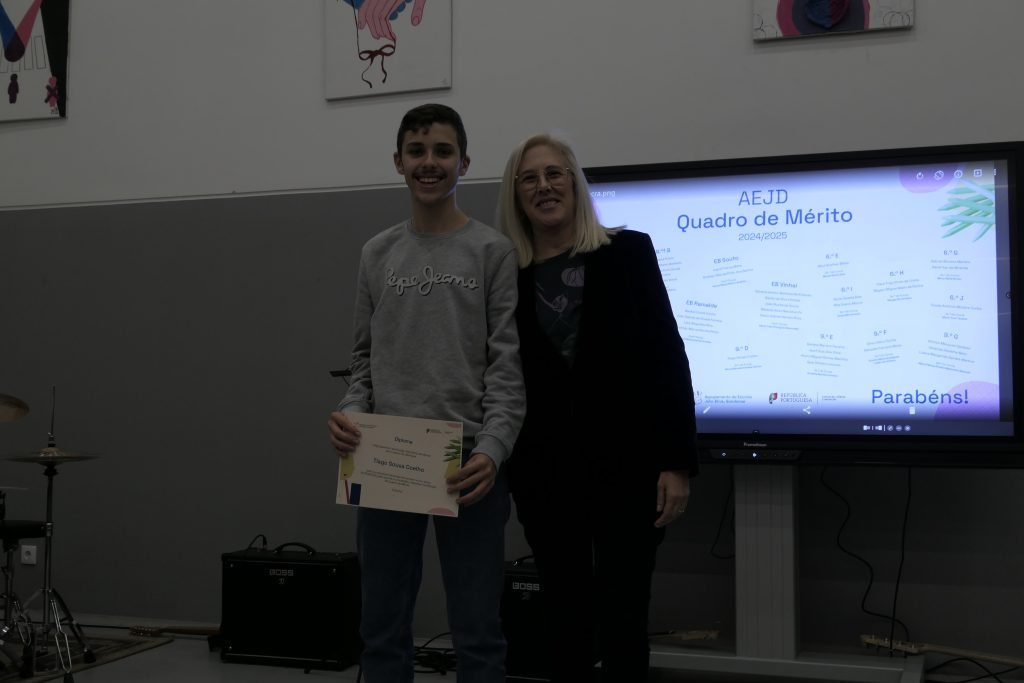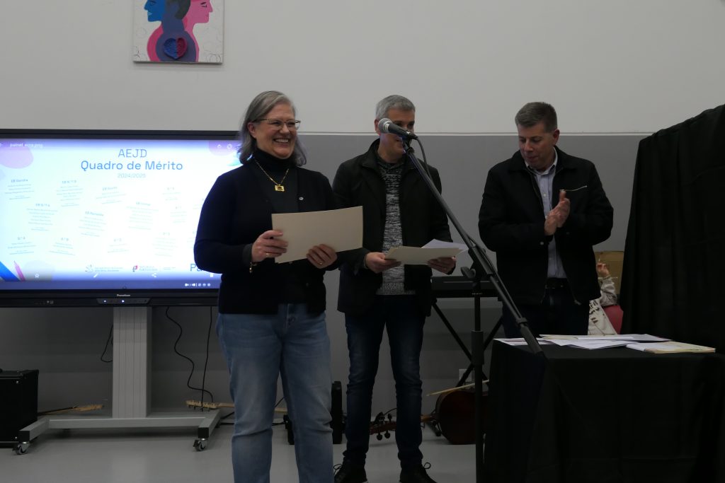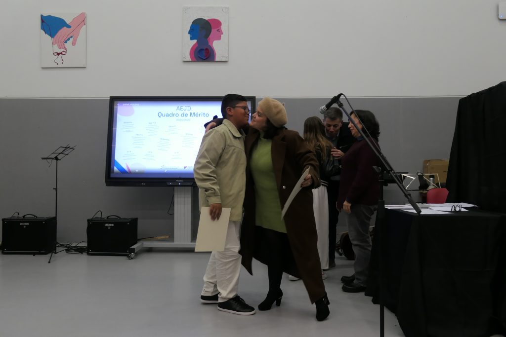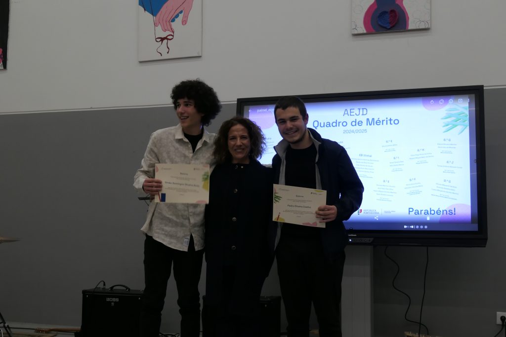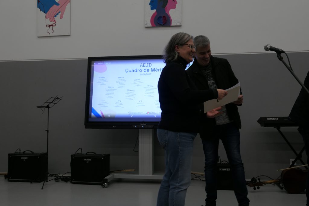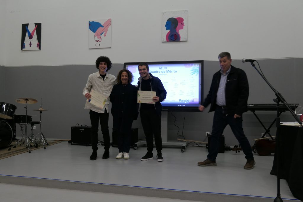 A cerimónia foi marcada por momentos de emoção e boa disposição. Destacaram-se as atuações musicais, com a participação de uma aluna do ensino articulado acompanhada pela mãe, num dueto lindíssimo de violoncelo e flauta transversal, e pela energia da banda da escola Old School. Entre as entregas dos diplomas, houve ainda um vídeo com testemunhos de antigos alunos, que partilharam memórias e experiências vividas na nossa escola, inspirando os presentes.
